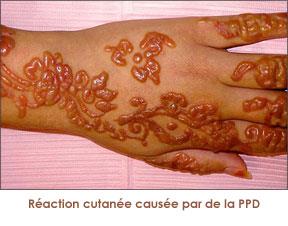 La PPD est une substance très allergisante, autorisée dans les teintures pour cheveux, mais interdite dans les produits à appliquer directement sur la peau. Avec le henné pur, les réactions allergiques sont rares. Quand les préparations colorantes ne contiennent que du henné, il faut plusieurs heures pour colorer la peau et la coloration obtenue est orange à marron rouge.