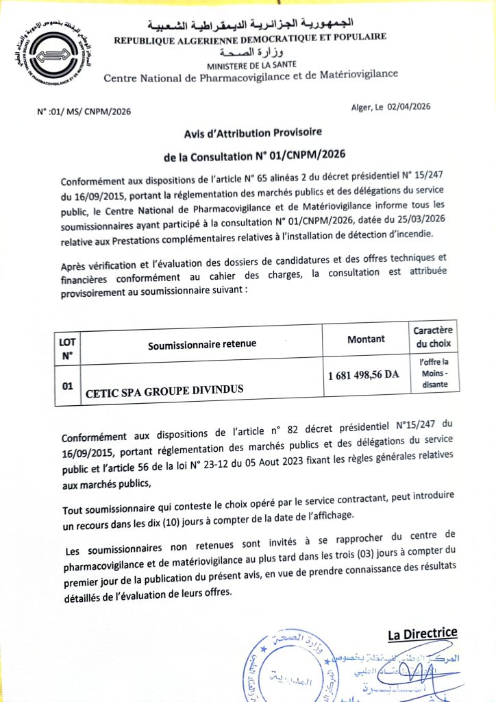 Accueil Toutes les avis Catégorie : Avis d'attribution Avis d’attribution provisoire de la Consultation N°01/CNPM/2026